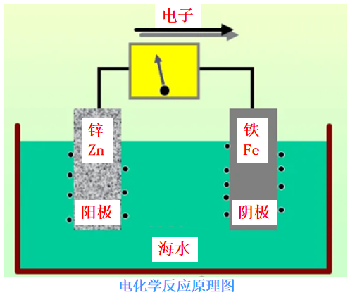 当两种金属或含杂质的金属被置于电解液中(海水就是电解液),金属活动性强(下图中的锌Zn)容易失去电子,被氧化,发生氧化反应,成为被消耗的阳极;金属活动性弱者(下图中的铁Fe)得电子,被还原,发生还原反应,成为被保护的阴极。
