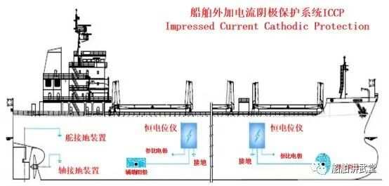外加电流阴极保护系统ICCP就是利用电化学腐蚀的原理,把外部交流电转变成低压直流电,通过辅助阳极对船体施加一定的直流电流。当电路接通后,利用整流器或恒电位仪维持船体处于较低的电位,根据处于海水中的船体电位变化,主动释放出电子,保护船体、舵桨等免遭腐蚀:由连接外部直流电源的阳极直接向被保护的船体施加电流,不间断地提供电子,进而在船体表面富集电子,并通过控制船体电位或电流强度,使船体发生阴极极化(把整个船体变 成阴极),电流从辅助阳极经海水至船体构成闭合回路,船体表面金属腐蚀溶解过程就会得到有效抑制,从而达到降低甚至完全抑制船体浸水部分的电化学腐蚀,这样就可以替代牺牲阳极保护装置的锌块或者铝块的作用,对船体进行保护。