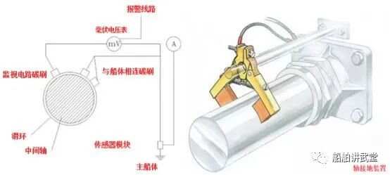 轴系接地保护装置通常由:固定在主机中间轴上的铜合金滑环、滑环架、含银石墨碳刷、碳刷座、接地线、装置底座、毫伏表以及与轴系接地保护装置相连接的报警线路组成。一般设有三只含银石墨碳刷,两只直接和船体相连,用于降低轴系和船体之间的电势差,另外一只与显示和监测轴系和船体之间电位差的毫伏表相连。