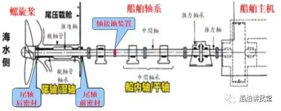 螺旋桨的材料通常是铜,轴系的材料通常是钢,钢相对于铜来说是活跃金属,腐蚀总是从活跃的金属开始。螺旋桨与轴系之间的电势差就会产生从螺旋桨(铜)流向轴系(钢)的电流。如果轴系与船体直接接触,该电势差就会转移到船体上,不会对轴系发生电化学腐蚀。