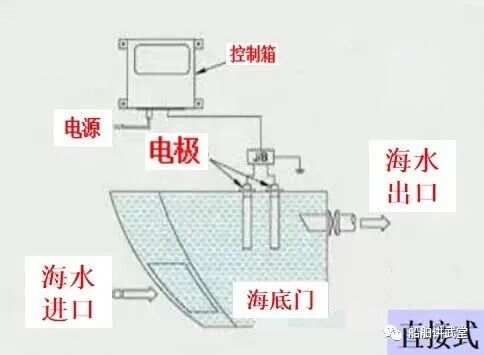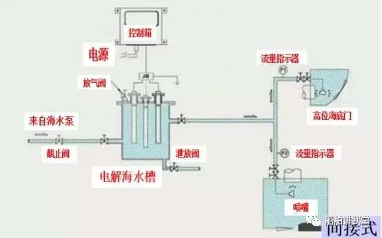 间接式安装法是将电极安装在海水槽中, 更换电极方便(只需关闭海水槽进出口阀即 可),但机舱需要有足够的空间来安装电解海 水槽。间接式安装法的工作原理与支路电解压 载水处理系统相似。