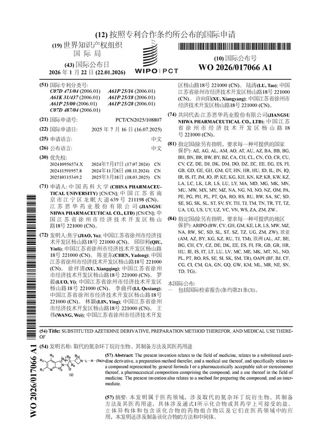 证券之星消息,根据企查查数据显示恩华药业(002262)公布了一项国际专利申请,专利名为“取代的氮杂环丁烷衍生物、其制备方法及其医药用途”,专利申请号为PCT/CN2025/108807,国际公布日为2026年1月22日。