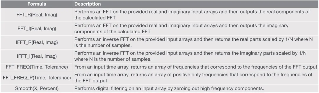 表1列出了内置的FFT函数及其描述。这些方程对输入数组的实部和虚部行FFT变换或FFT逆变换,然后获得对应的输出实部或虚部分量。其中两个公式从输入时间数组返回频率数组。平滑函数通过将高频分量归零,对输入数组进行数字滤波。