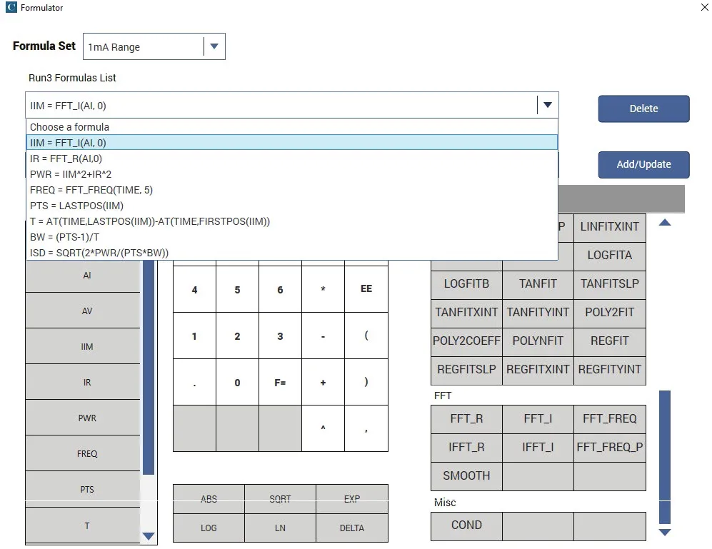 Clarius软件有一个内置的公式编辑器,能够对测试数据和其他计算结果进行数据计算。公式编辑器提供了各种计算函数、常用数学运算符和常用常量。从Clarius V1.9版本开始,FFT公式已添加到编编辑器中。图1显示了带有FFT的函数编辑器的截图。