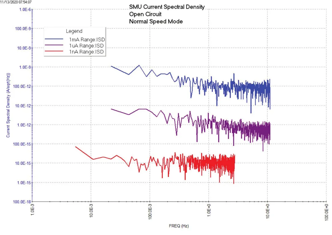 三次测试运行得到的电流谱密度与频率曲线所示。因为测量的是用开路的电流,所以基本上是推导出来的是SMU的本底噪声。频率会根据定时设置而发生变化。