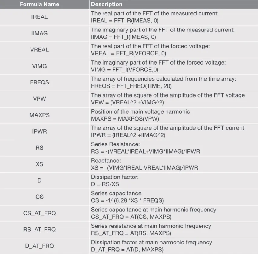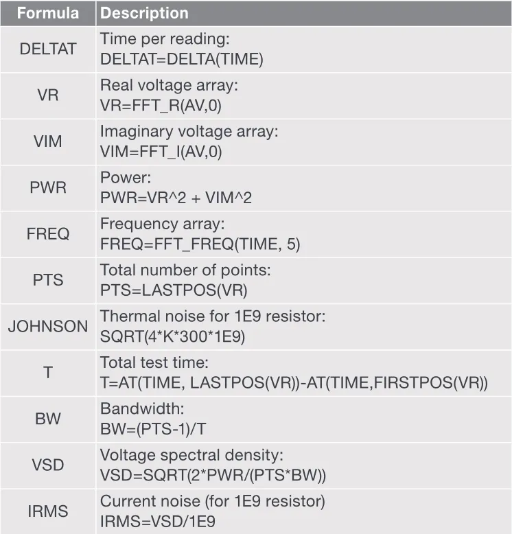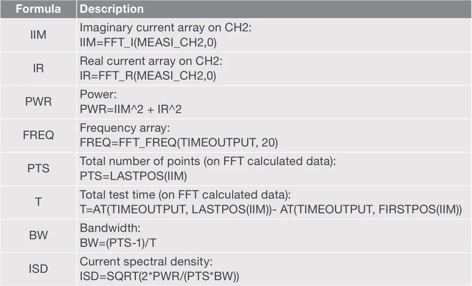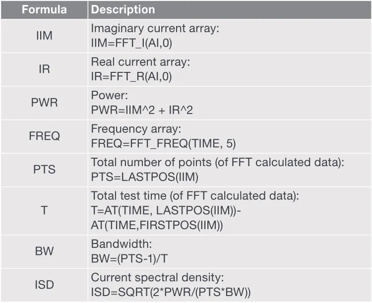 本测试中的测量是在固定的电流量程上进行的。使用固定量程,而不是自动量程,这对于保持每个读数的测量时间恒定是非常重要的,这是FFT计算所需要的。之所以使用sampling测试模式,是因为加载了一个恒定的偏置。在该模式下,必须输入读数的个数。尽管在使用FFT计算时需要大量的读数,但这并不实用。在这个测试中,读取了1024个读数,因为1024是2的幂次方。表2列出了SMU电流谱密度测试的公式。