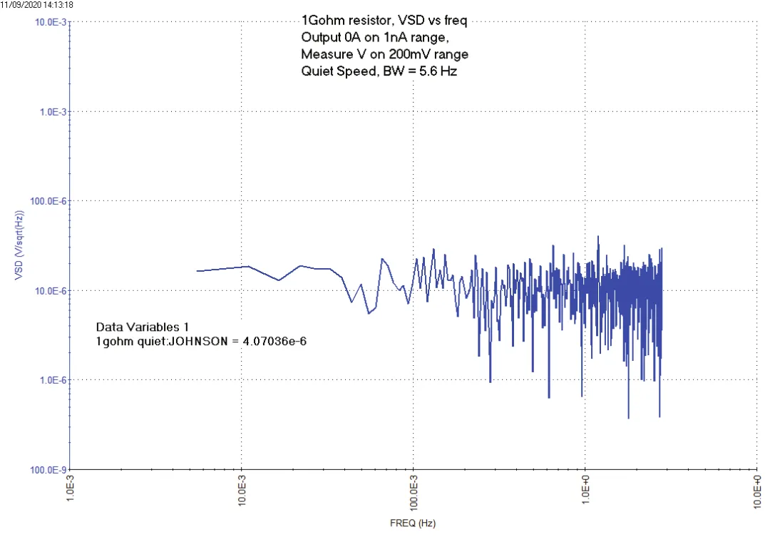 在这个测试中,直流电压测量是在200mV 量程上进行的,在1nA量程上施加0A。计算1GΩ电阻的噪声电流和约翰逊噪声。1GΩ电阻的热噪声理论计算值约为4E-6Vrms,使用公式:vn=sqrt(4*k*TEMP* 1e9)。电阻器热功率噪声的实际公式为: