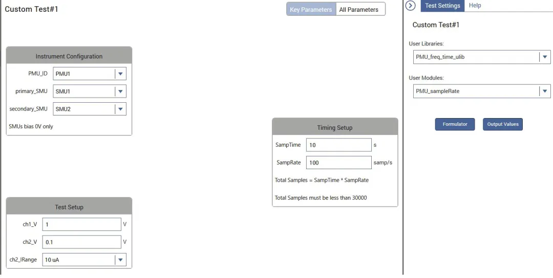 和SMU一样,4225-PMU的电流谱密度也可以通过电流和时间的测量以及FFT计算得出。在测试库中可以找到pmu-isd,在100μA和100nA范围内测试计算 PMU 开路的电流谱密度。这个测试是通过使用PMU_freq_time_ulib用户库中的PMU_sampleRate用户模块生成的。使用PMU测试,我们可以在CH1和CH2上加载电压偏置,选择CH2的电流范围,并指定总测试时间和采样率。pmu-isd测试的配置如图5所示。