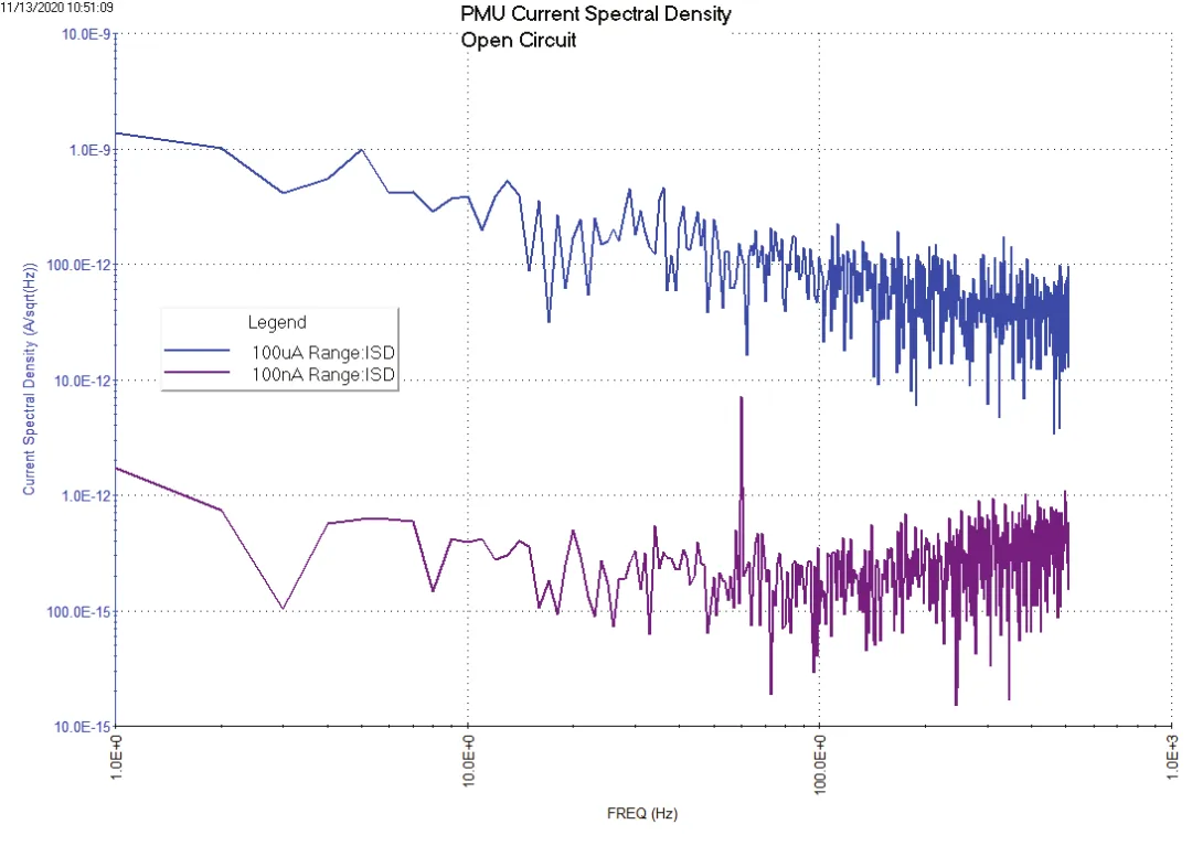 与 SMU 电流谱密度测试一样,公式编辑器有几个公式可以推导出测试电流的带宽、实部分量和虚部分量、功率、频率和电流谱密度。图6显示了100µA和100nA档位下电流谱密度与频率的函数曲线。由于数据是用开路采集的,因此这些是在固定电流量程上以可选采样率测量到的PMU本底噪声。