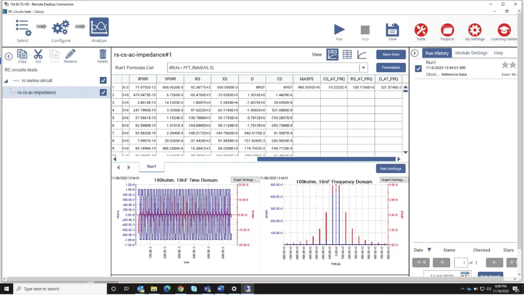 使用双通道4225-PMU结合内置的FFT计算公式,可以提取RC电路的AC阻抗参数。PMU在时域测量电流和电压,Clarius公式编辑器中的FFT通过计算将这些测试结果转换为频域的相关参数。