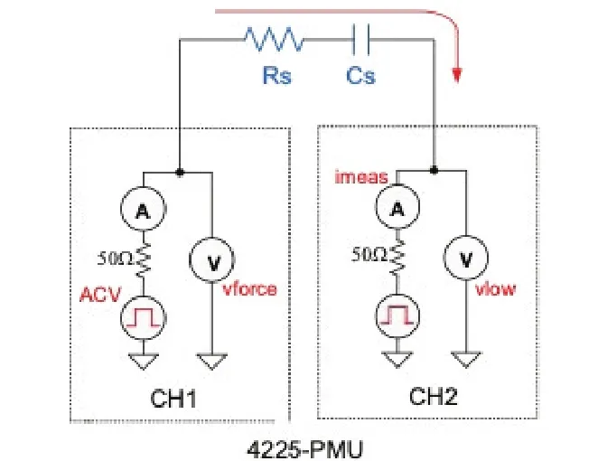 例如,可以在PMU的CH1和CH2之间连接串联 RC电路,如图7所示。CH1输出周期性脉冲波形 (ACV),CH2测量产生的电流 (imeas)。通过 FFT 计算得到测试电路的AC阻抗参数,如串联电阻(Rs)和电抗 (Xs),以及阻抗的实部和虚部。电容(Cs)和耗散因子(D)可以用Rs和Xs推导出来。