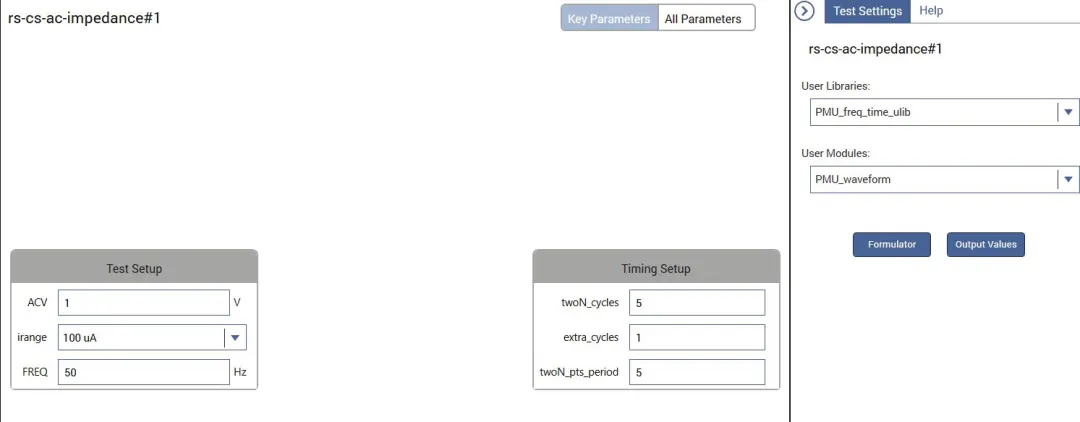 R-C Circuit AC Impedance Calculations (rs-cs-ac-impedance)测试项,包含RC串联电路的AC参数。在这个测试示例中,PMU的CH1输出一个具有指定幅度和测试频率的脉冲波形。还指定了周期数和每个周期上的测试点数。在公式编辑器中配置计算,以提取100kΩ,10nF,R-C串联电路的AC阻抗参数。此测试的配置如图8所示。