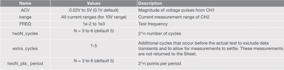 在此测试中,在配置视图中输入CH1的电压脉冲幅值 (ACV)、CH2的电流测量范围 (irange)、测试频率 (FREQ)、2^n个周期和2^n个点。表5列出了本次测试的输入参数。基于这些输入参数,PMU构建具有电流测量值的电压段波形。