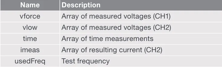 对于本次测试,总点数=32x32=1024。CH1上的测量脉冲电压(vforce),CH2的电压(vlow),时间和 CH2上的测量电流(imeas)的数组返回到表中。输出参数的描述参考在表6。从返回值中,可以提取许多AC参数。对于本次测试,RC串联电路的所有计算参数如表7所示。